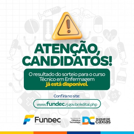 A Prefeitura de Duque de Caxias, através da Fundação de Apoio à Escola Técnica, Ciência, Tecnologia, Esporte, Lazer, Cultura e Políticas Sociais (Fundec), informa que já está disponível o resultado do sorteio para o curso gratuito de Técnico em Enfermagem da instituição. .