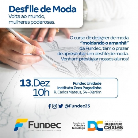 A Fundec promoverá, na próxima terça-feira (13), o desfile dos alunos do curso de Design de Moda, na unidade Zeca Pagodinho, às 10 horas. Os alunos irão apresentar sua coleção de roupas em um desfile que tem como tema: “Volta ao mundo, mulheres poderosas”..