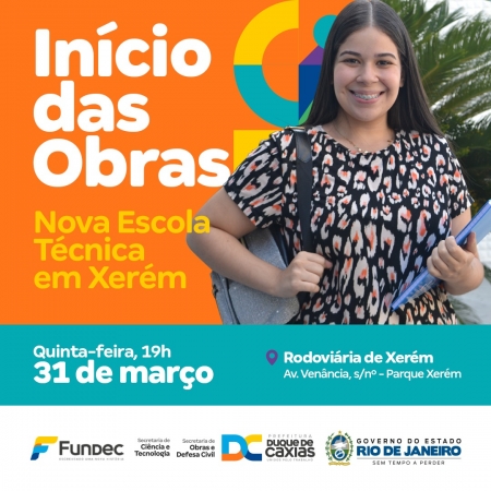 O prefeito de Duque de Caxias, Washington Reis, anuncia nesta quinta-feira (31), às 19h, em Xerém, no quarto distrito, o início das obras de construção da Escola Técnica que será administrada pela Fundec - Fundação de Apoio à Escola Técnica, Ciência, Tecnologia, Esporte, Lazer, Cultura e Políticas Sociais de Duque de Caxias. Da parceria participam a Secretaria Municipal de Ciência e Tecnologia e o governo do estado..