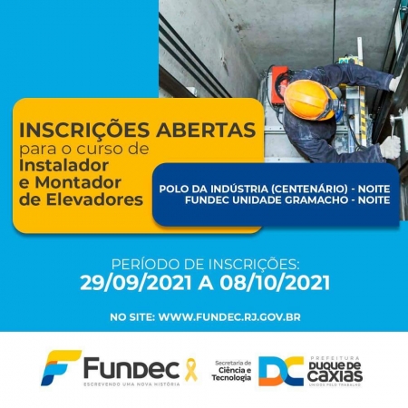 A Prefeitura de Duque de Caxias, por meio da Fundec, em parceria com a Secretaria Municipal de Ciência e Tecnologia, promove o curso gratuito de qualificação profissional em instalação e montagem de elevadores. Ao todo, estão sendo oferecidas 70 vagas distribuídas entre o Polo da Indústria (Centenário) e Unidade Gramacho, ambas com turmas no turno da noite. .