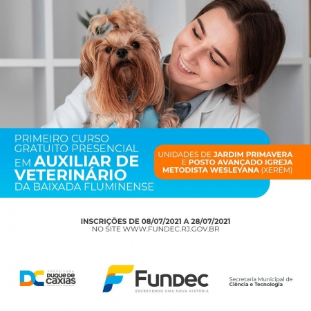 A Prefeitura de Duque de Caxias, por meio da Secretaria Municipal de Ciência e Tecnologia e a Fundec, está com vagas abertas para o primeiro curso gratuito presencial de auxiliar veterinário da Baixada Fluminense. As aulas serão ministradas em duas unidades da Fundação: Jardim Primavera e Posto Avançado Igreja Metodista Wesleyana, com 60 vagas totais..