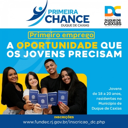 No momento em que a taxa de desemprego atinge 14,6% e afeta mais de 14 milhões de pessoas em todo o país, especialmente os mais jovens, a Prefeitura de Duque de Caxias criou o Programa Municipal de Aprendizagem, denominado ‘Primeira Chance’. A iniciativa funciona como um instrumento de fomento ao primeiro emprego, erradicação da pobreza e valorização do trabalho dos jovens de 18 a 20 anos de idade residentes no município. Caso o aprendiz seja pessoa com deficiência, não há limite máximo de idade. .