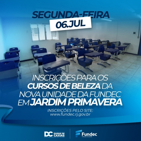 A Prefeitura de Duque de Caxias vai inaugurar nesta quinta-feira (02), às 19h, em Jardim Primavera, mais um Centro de Ensino da Fundec - Fundação de Apoio à Escola Técnica, Ciência, Tecnologia, Esporte, Lazer, Cultura e Políticas Sociais. Na unidade, serão ofertadas aproximadamente 1.100 vagas já para este segundo semestre. .