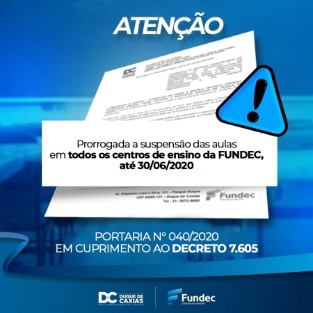 A Prefeitura de Duque de Caxias, através da Fundec, publicou na última segunda-feira (15), a portaria n° 0402020, que prorroga até o dia 30 de junho a suspensão das aulas em todos os 26 Centros de Ensino da Fundação. A medida reforça a necessidade da prevenção para evitar o contágio do novo coronavírus (Covid-19). O presidente da Fundação, professor Joílson Cardoso, está seguindo a recomendação do Decreto Municipal n° 7605, assinado pelo prefeito Washington Reis. Todo o conteúdo programático previsto será reposto no momento necessário, pois os Centros de Ensino estão se preparando para poder retomar as aulas de maneira segura..
