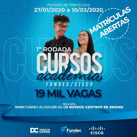 A Prefeitura de Duque de Caxias, através da Fundec - Fundação de Apoio à Escola Técnica, Ciência, Tecnologia, Esporte, Lazer, Cultura e Políticas Sociais, iniciou nesta segunda-feira (27/01), o período de inscrições para os cursos da Academia Fundec/Cisco. São 19 mil vagas disponíveis para cursos de ensino à distância. As inscrições vão até o dia 10/02. .