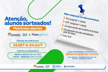 A Fundec (Fundação de Apoio à Escola Técnica, Ciência, Tecnologia, Esporte, Lazer, Cultura e Políticas Sociais de Duque de Caxias), em parceria com o SENAI-RJ (Serviço Nacional de Aprendizagem Industrial), divulgou o resultado do sorteio eletrônico, por meio do site, www.fundec.rj.gov.br , para os cursos de qualificação profissional gratuitos oferecidos no município..