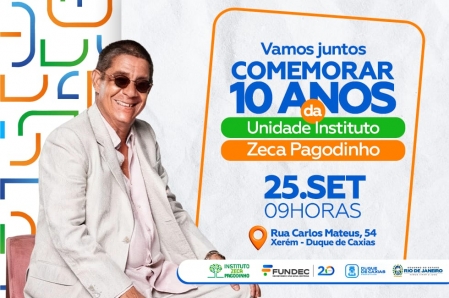 A Unidade da Fundação de Apoio à Escola Técnica, Ciência, Tecnologia, Esporte, Lazer, Cultura e Políticas Sociais de Duque de Caxias (Fundec) –Instituto Zeca Pagodinho, localizada em Xerém, celebrará, nesta quinta-feira, 25/09, às 9h, os dez anos de parceria..