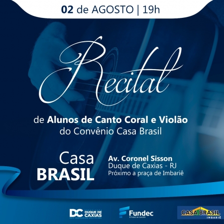 A Prefeitura de Duque de Caxias, por meio da Fundec - Fundação de Apoio à Escola Técnica, Ciência, Tecnologia, Esporte, Lazer, Cultura e Políticas Sociais, apresenta nesta sexta-feira (02/08), às 19h, no auditório da Casa Brasil de Imbariê um recital de alunos de Canto e Violão. O espetáculo contará com a presença de 45 alunos, 15 deles usando violão e os outros 30 na formação do coral apresentando músicas populares. .