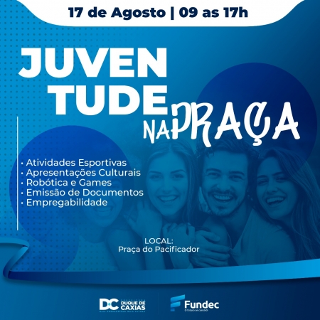 Neste sábado, 17/08, Duque de Caxias receberá o projeto Juventude na Praça. O projeto é uma iniciativa da Superintendência de Juventude, vinculada à Secretaria de Esporte, Lazer e Juventude do Estado, em conjunto com o Conselho Municipal de Juventude e apoio da Prefeitura Municipal de Duque de Caxias. O objetivo é valorizar as aptidões dos jovens da periferia e dos movimentos e coletivos juvenis da cidade. .