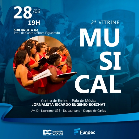 A Prefeitura de Duque de Caxias, através da Fundec - (Fundação de Apoio à Escola Técnica, Ciência, Tecnologia, Esporte, Lazer, Cultura e Políticas Sociais) vai realizar na próxima sexta-feira (28/06), às 19h, a segunda edição do projeto Vitrine Musical, no Polo de música Ricardo Eugênio Boechat. Os encontros acontecem uma vez por mês, com duração de 50 minutos e a entrada é gratuita. .