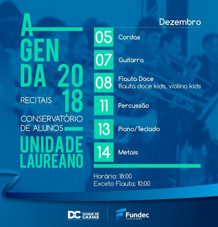 A Prefeitura de Duque de Caxias, através da Fundec, promove nos dias 5, 7, 8, 11, 13 e 14 de dezembro a semana de Recitais dos alunos do Conservatório Musical da Fundec, na unidade Doutor Laureano..