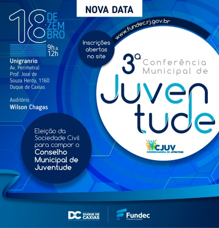A Prefeitura de Duque de Caxias, através da Fundec, promove no próximo dia 17/12 a 3° Conferência Municipal da Juventude, recebendo jovens de todos os distritos de Duque de Caxias. O objetivo é dar continuidade no processo de ampliação dos espaços de participação e diálogo entre poder público e sociedade civil, organizado pela Coordenadoria Municipal de Políticas para a Juventude. Na Conferência, serão eleitos os membros da sociedade civil para a composição do Conselho Municipal de Juventude de Duque de Caxias. .