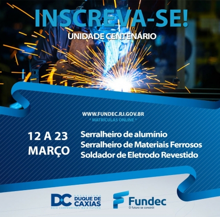 A Prefeitura Municipal de Duque de Caxias, através da Fundec (Fundação de Apoio à Escola Técnica, Ciência, Tecnologia, Esporte, Lazer, Cultura e Políticas Sociais) abriu nesta segunda-feira (12), as inscrições para os Cursos de Solda e Serralheria, na Unidade Centenário, no 1º Distrito do município. .