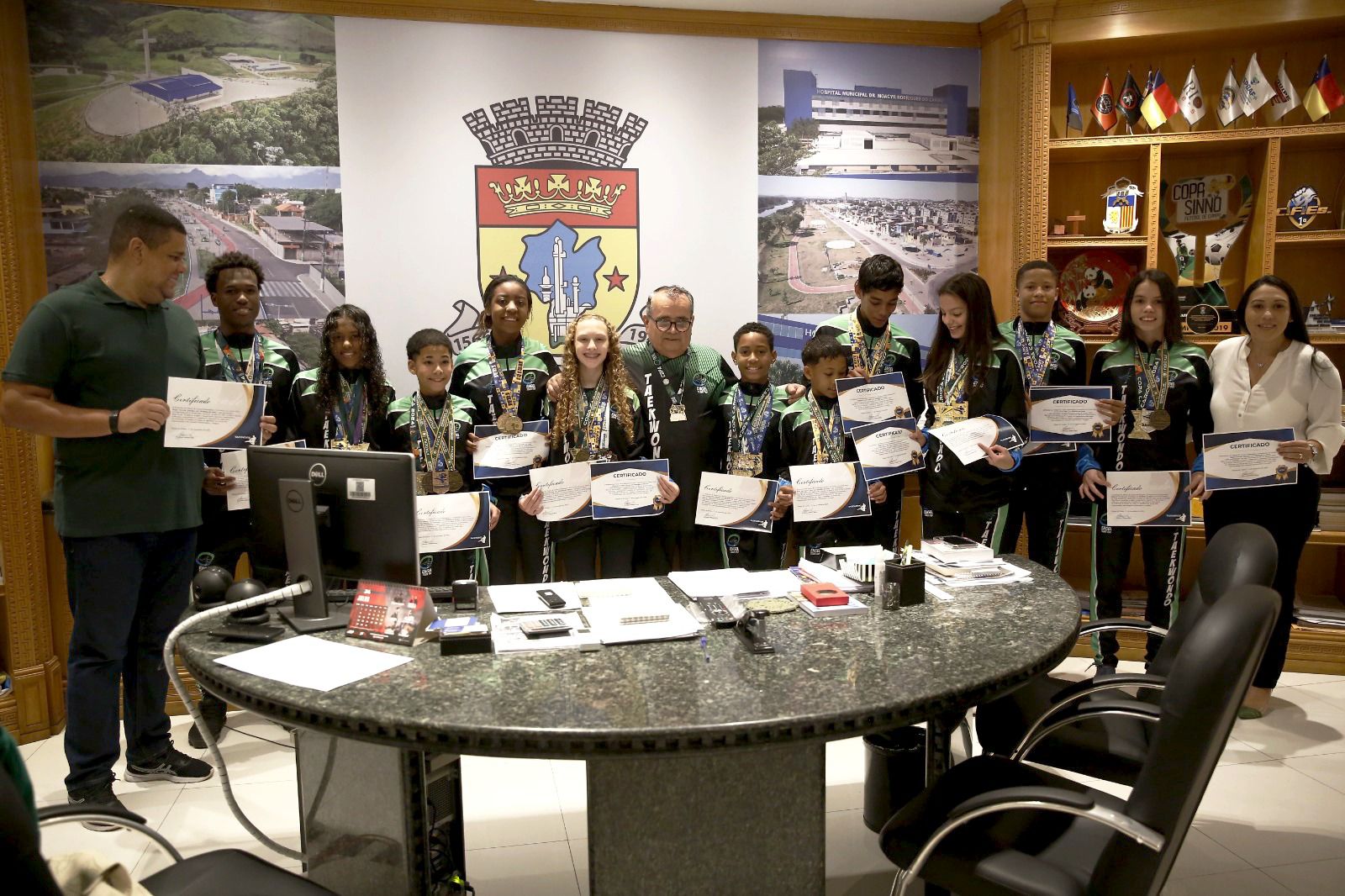 O Prefeito de Duque de Caxias, Wilson Reis, recebeu, em seu gabinete, nesta quinta-feira (14), a equipe duque-caxiense Engeltean, alunos da Fundec e a mestra de Taekwondo Leidiana, que representam o município em competições nacionais e internacionais. Em todas as competições os atletas mostraram resultados expressivos, trazendo, além de muito orgulho para Duque de Caxias, inúmeras medalhas.