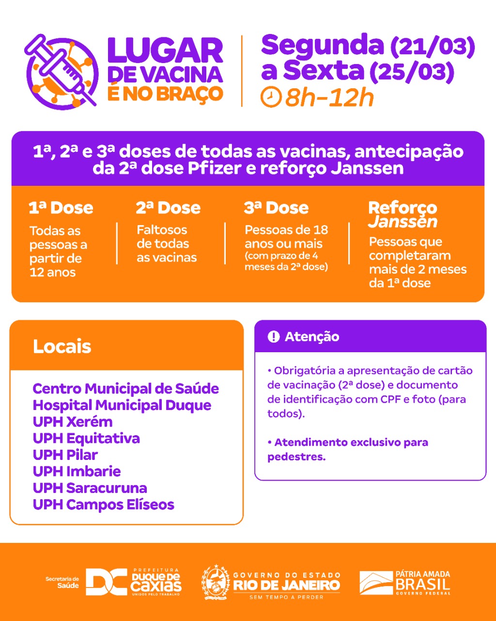 Vacinação contra a Covid-19 para adolescentes a partir de 12 anos e adultos - Durante a semana também acontece a aplicação de todas as doses da vacina contra a Covid-19, nas seguintes unidades, das 8h às 12h: Hospital Municipal Duque - Centro Municipal de Saúde (CMSDC) - UPH Campos Elíseos - UPH Equitativa - UPH Imbariê - UPH Pilar - UPH Saracuruna - UPH Xerém. As unidades da rede de Atenção Básica também disponibilizam as três doses da vacina, das 8h às 12h.