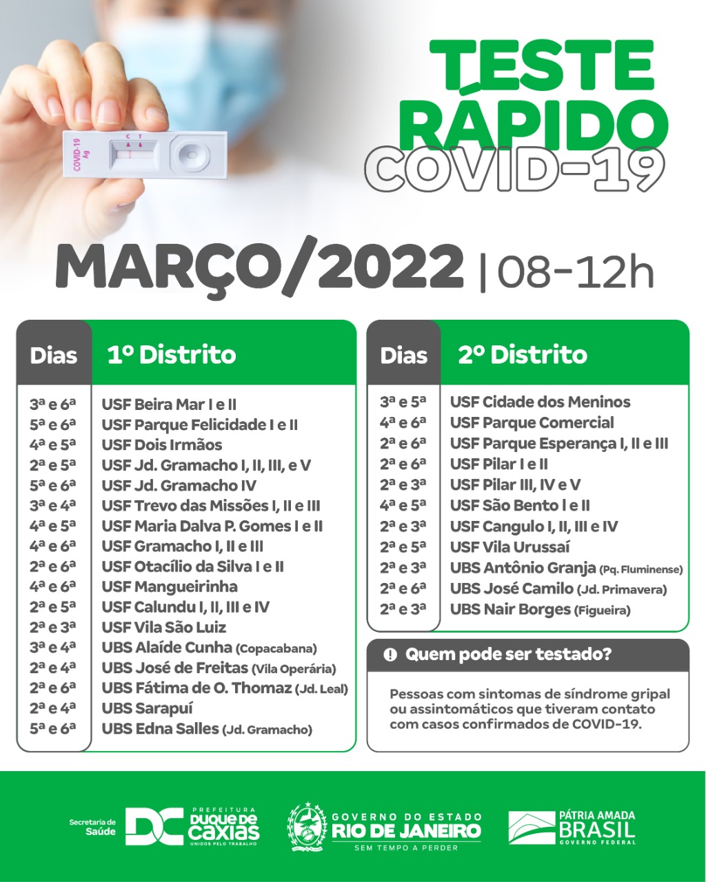 Confira a lista e os dias de Testagem Rápida no mês de Março, nas unidades de Atenção Básica de Duque de Caxias, das 8h às 12h: