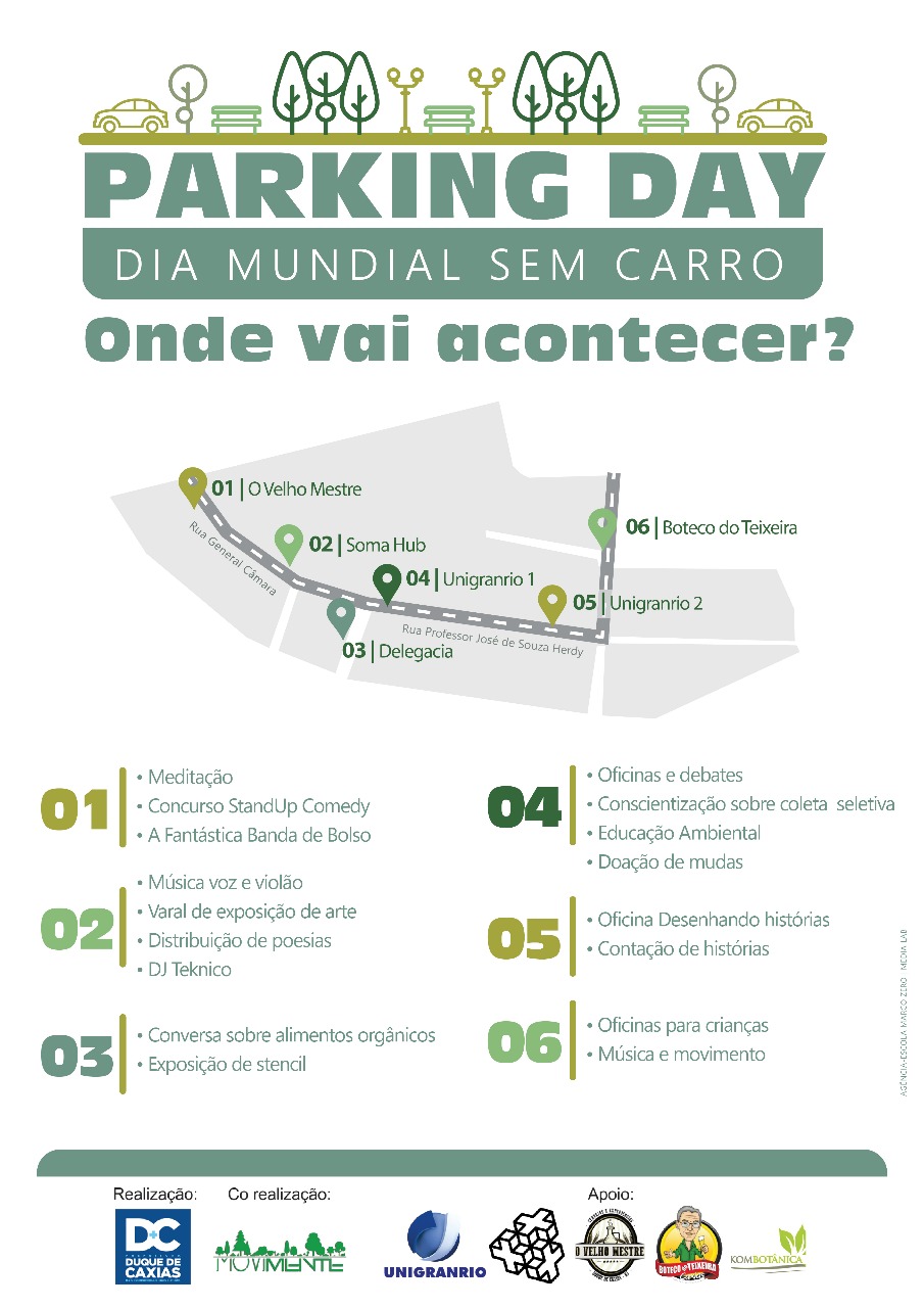 Nesta sexta-feira, dia 22 de setembro, a Prefeitura de Duque de Caxias, através das secretarias municipais de Urbanismo e Habitação e Cultura e Turismo, promoverá o evento Park(ing) Day Duque de Caxias para celebrar o Dia Mundial Sem Carro. A iniciativa conta com as parcerias do Coletivo Movimente, comerciantes do Bairro 25 de Agosto e Unigranrio.