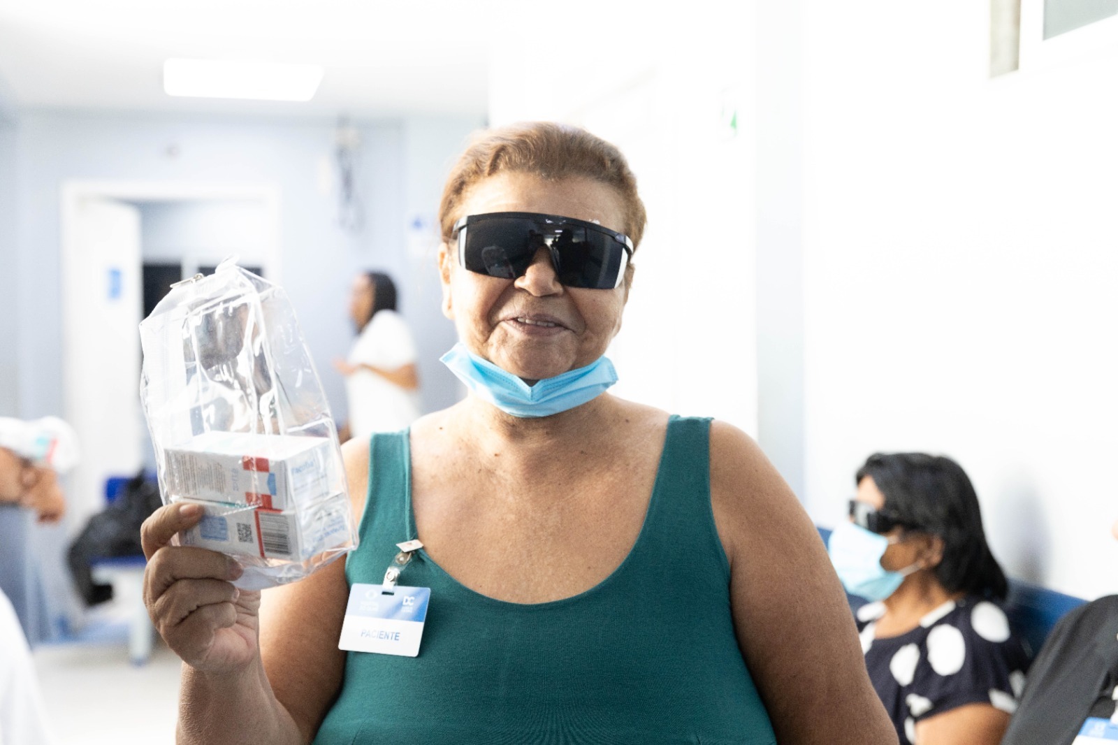 “Acabei de sair da cirurgia e estou muito bem e animada para me recuperar logo e voltar a dirigir. Não senti nenhuma dor e foi tudo muito rápido. E pra ficar melhor ainda, estou saindo daqui levando um kit com colírio e óculos, tudo gratuito!”, declarou a animada Maria do Socorro.