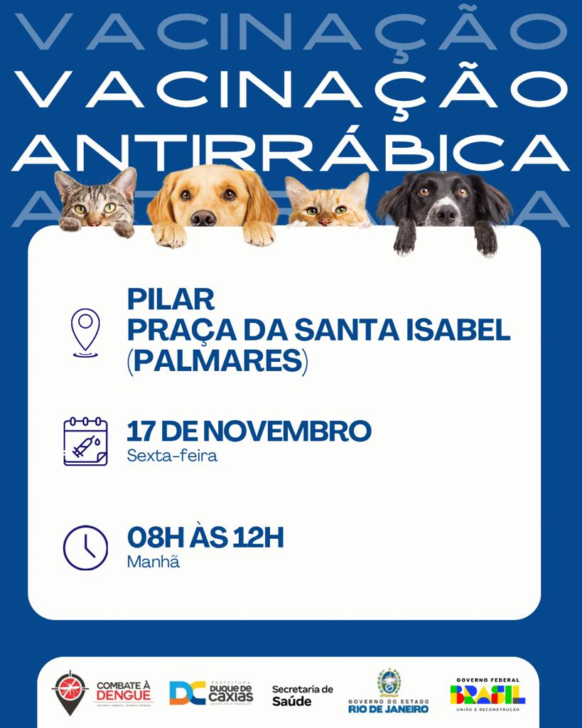 Dando continuidade à campanha de Vacinação Antirrábica para cães e gatos, a Secretaria Municipal de Saúde de Duque de Caxias, através da Superintendência de Vigilância Ambiental, Vetores e Zoonoses (SVAVZ), estará nos bairros Parque Fluminense e Pilar, nesta sexta-feira (17/11). O atendimento acontecerá no período das 08h às 12h.