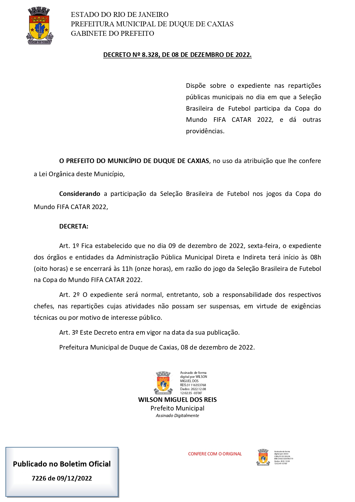 O prefeito de Duque de Caxias, Wilson Reis, alterou, por decreto, o horário de funcionamento dos órgãos e entidades da Administração Pública Municipal Direta e Indireta, nesta sexta-feira (9), dia de jogo da Seleção Brasileira de Futebol na Copa do Mundo. Os órgãos funcionarão das 8h às 11h. Pelo decreto, o expediente será normal, entretanto, sob a responsabilidade dos respectivos chefes, nas repartições cujas atividades não possam ser suspensas, em virtude de exigências técnicas ou por motivo de interesse público.
