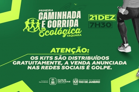 A Caminhada e Corrida Ecológica da Taquara será realizada no domingo, dia 21 de dezembro, a partir das 7h30, no Parque Natural Municipal da Taquara, localizado no bairro de Imbariê, em Duque de Caxias. Os primeiros 200 inscritos têm direito a um kit gratuito. A organização da corrida e caminhada pede que cada participante leve 1 quilo de alimento não perecível no dia do evento. Os alimentos arrecadados serão destinados a famílias em situação de vulnerabilidade social. O evento é promovido pela Prefeitura de Duque de Caxias, por meio da Secretaria Municipal de Meio Ambiente, em parceria com o governo do estado, e faz parte das comemorações pelos 33 anos de criação do Parque Municipal da Taquara.