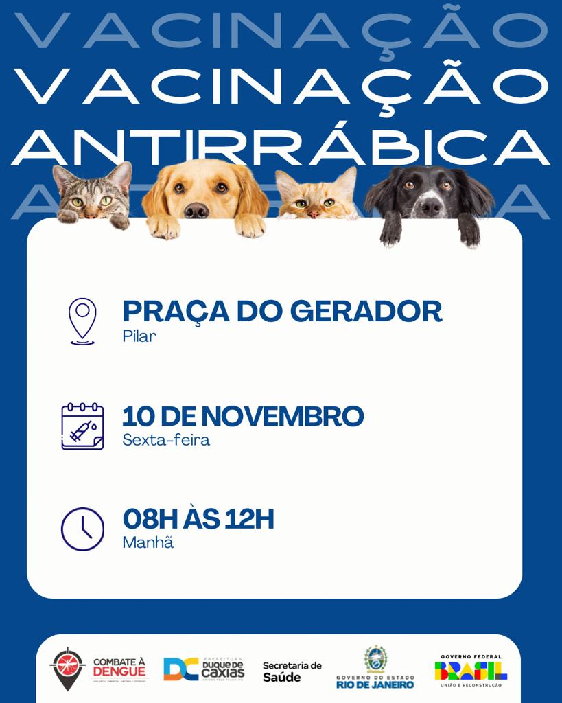 A Secretaria Municipal de Saúde de Duque de Caxias, através da Superintendência de Vigilância Ambiental, Vetores e Zoonoses (SVAVZ), levará a campanha de Vacinação Antirrábica para cães e gatos aos bairros Pilar e Saracuruna, nesta sexta-feira (10/11).