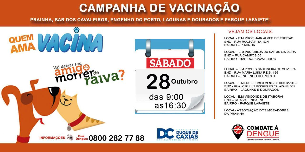 A secretaria de Saúde de Duque de Caxias, através da Coordenaria de Vigilância Ambiental e Zoonoses realiza neste sábado (28/10), das 9h às 16h30, noprimeiro distrito, mais uma etapa da campanha contra raiva animal. Seis postos vão funcionar nos bairros Prainha, Bar dos Cavaleiros, Engenho do Porto, Laguna e Dourados e Parque Lafaiete. A campanha “Quem ama vacina. Vai deixar seu amigo morrer de raiva” vai mobilizar a exemplo das etapas anteriores 50 agentes de saúde e voluntários e serão disponibilizadas cerca de cinco mil doses de vacina para cães e gatos.