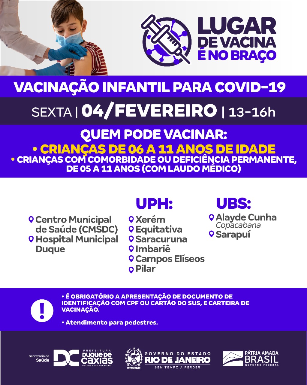 A Prefeitura de Duque de Caxias segue com a campanha de vacinação infantil no município, nesta sexta-feira (04/02). A faixa etária foi ampliada, passando a incluir as crianças de 06 anos. Podem receber a primeira dose todas as crianças de 06 a 11 anos e aquelas de 05 a 11 anos, com comorbidades ou deficiência permanente, mediante a apresentação de laudo médico. A Secretaria Municipal de Saúde alerta aos responsáveis sobre a obrigatoriedade de levar documento de identificação com CPF ou Cartão do SUS da criança.