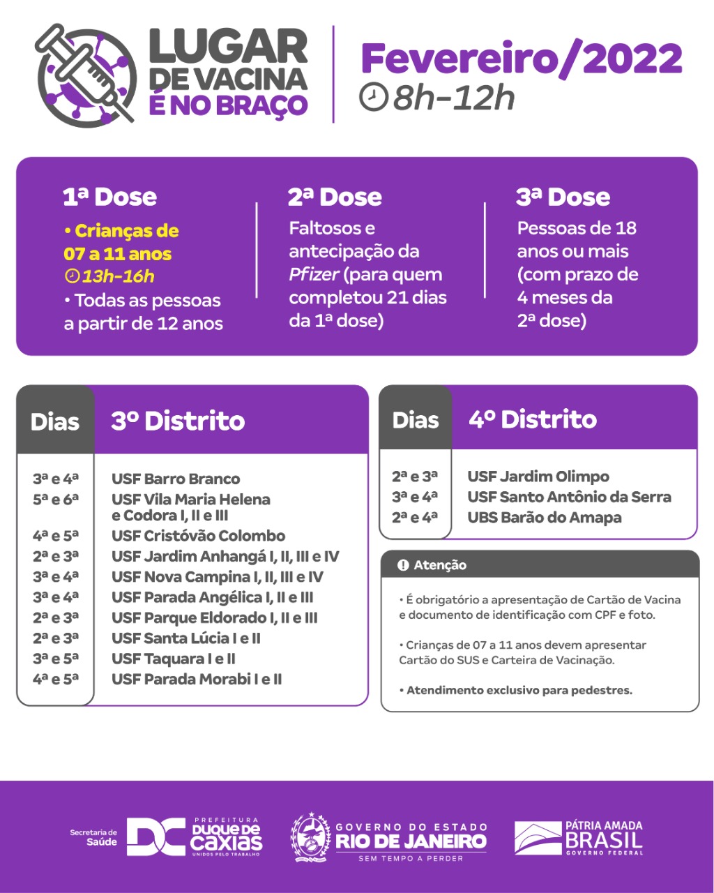 A vacinação para adolescentes e adultos (12 anos ou mais), também segue, de segunda a sexta-feira, das 8h às 12h, nas seguintes unidades: Hospital Municipal Duque - Centro Municipal de Saúde (CMSDC) - UPH Campos Elíseos - UPH Equitativa - UPH Imbariê - UPH Pilar - UPH Saracuruna - UPH Xerém.