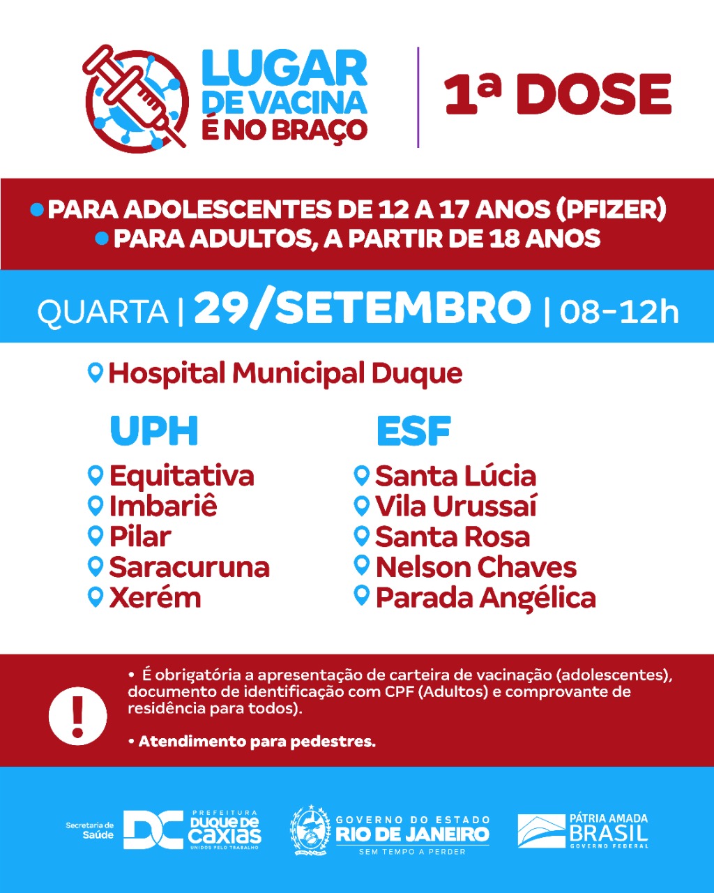 A Prefeitura segue com a primeira dose para adolescentes, com idade de 12 a 17 anos (com ou sem comorbidades), adultos com 18 anos ou mais. Para receber a primeira dose é obrigatória a apresentação de comprovante de residência e carteira de vacinação (adolescentes) e documento de identificação com CPF (adultos).