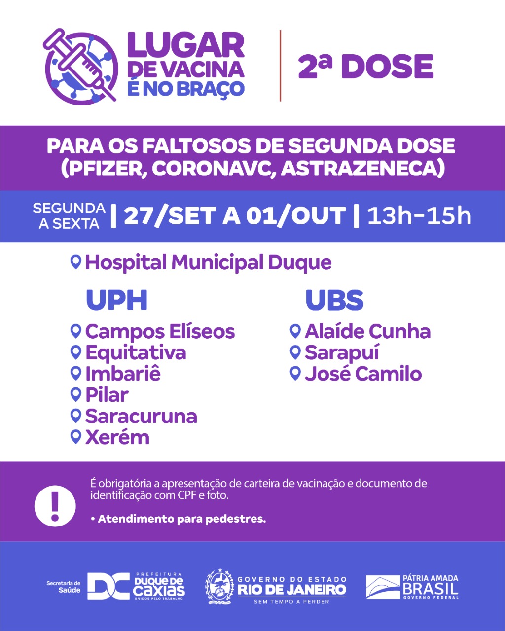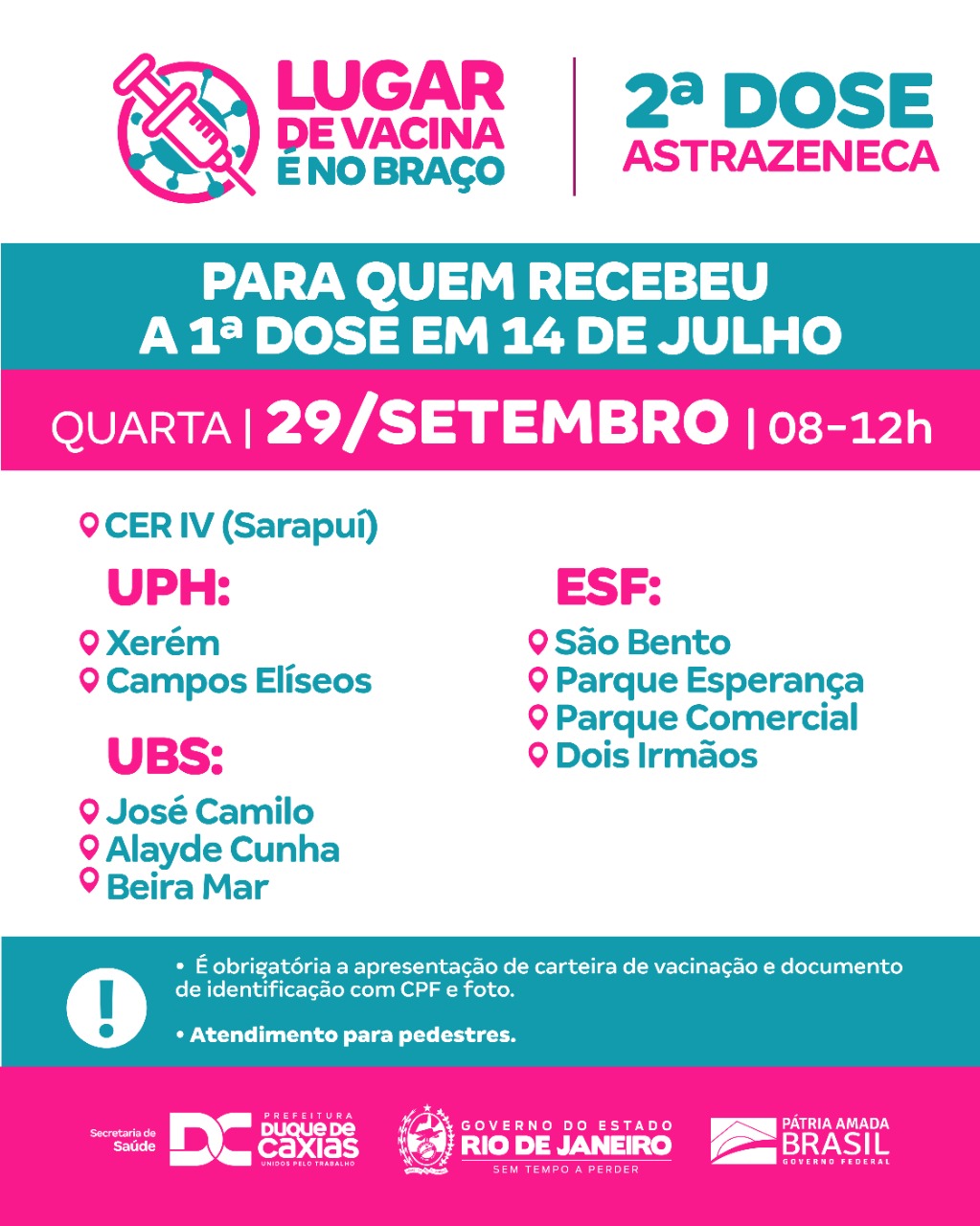 A vacinação nesta quarta-feira (29/09) em Duque de Caxias, terá a segunda dose da Astrazeneca para aqueles que receberam a primeira dose em 14 de julho. A Prefeitura segue também com a primeira dose para adolescentes (12 a 17 anos), adultos a partir de 18 anos de idade e gestantes, puérperas e lactantes (a partir de 12 anos). A segunda dose também continua para os faltosos de todas as vacinas. A Terceira Dose (reforço) está sendo aplicada nas pessoas com alto grau de imunossupressão e idosos (a partir de 70 anos).