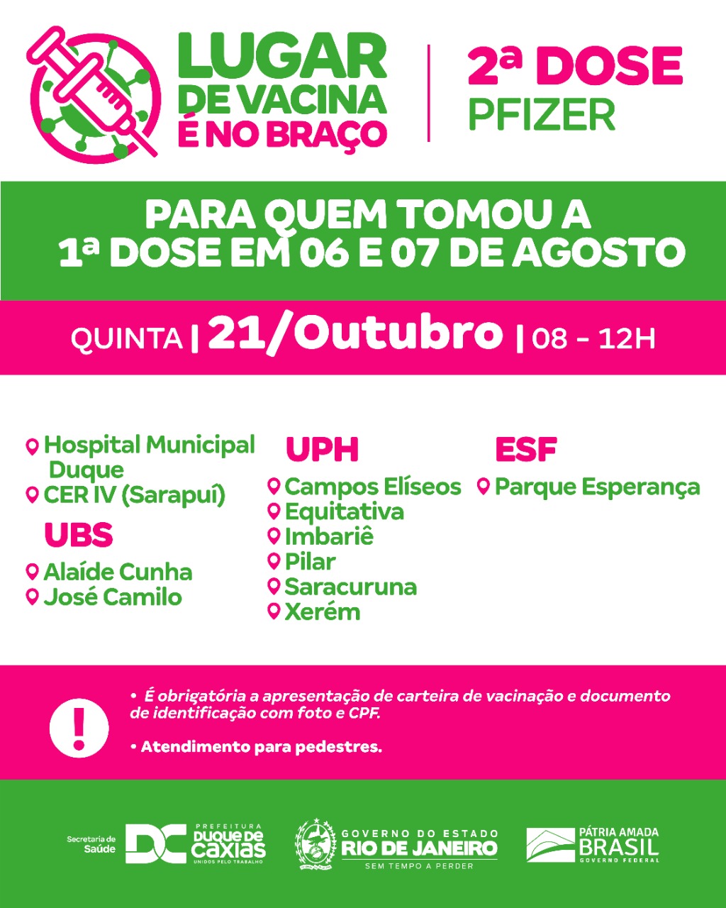 A Prefeitura de Duque de Caxias, através da Secretaria Municipal de Saúde, aplica, nesta quinta-feira (21/10), das 8h às 12h, a segunda dose da vacina Pfizer nas pessoas que receberam a primeira dose nos dias 06 e 07 de agosto. A vacinação de segunda dose para esses grupos vai ocorrer nos seguintes locais: Hospital Municipal Duque, CER IV (Sarapuí), UPH Campos Elíseos, UPH Equitativa, UPH Imbariê, UPH Pilar, UPH Saracuruna, UPH Xerém, UBS Alaíde Cunha, UBS José Camilo e ESF Parque Esperança.