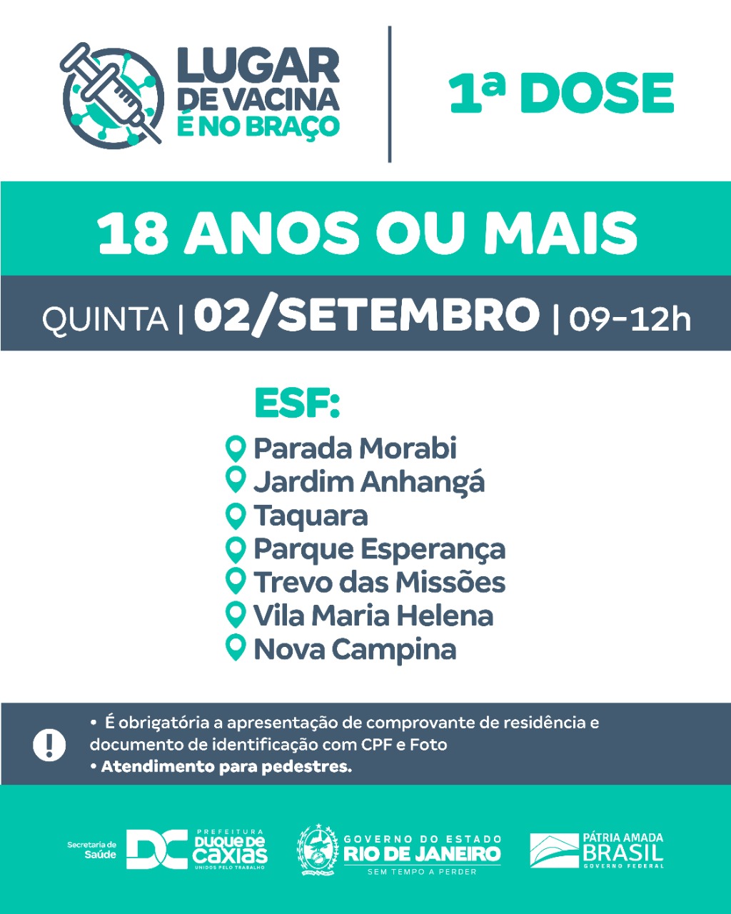 Todos que receberam a primeira dose de Coronavac na data de 11 de agosto, deverão comparecer para completar a imunização com a segunda dose. Quem foi vacinado na Estação Caxias da SUPERVIA nesta data, deverá comparecer ao Hospital Municipal Duque. É obrigatória a apresentação da carteira de vacinação e de Documento de identificação com CPF e foto.