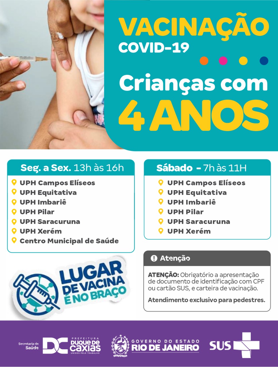 Obrigatório a apresentação de cartão de vacinação e documento de identificação com CPF e foto. Atendimento exclusivo para pedestres.