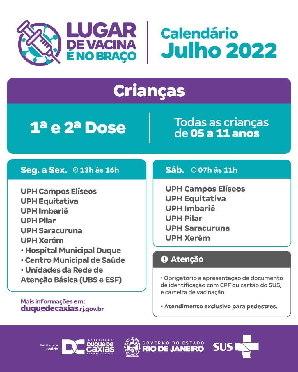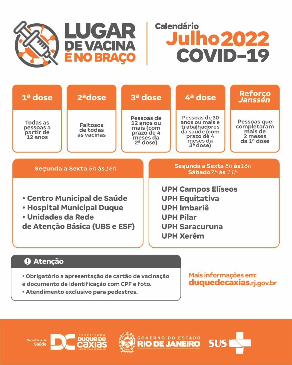 A Prefeitura de Duque de Caxias, através da Secretaria Municipal de Saúde, divulga o calendário de vacinação contra a Covid-19 e Gripe para a semana (25/07 a 30/07) nas unidades de saúde pública no município.