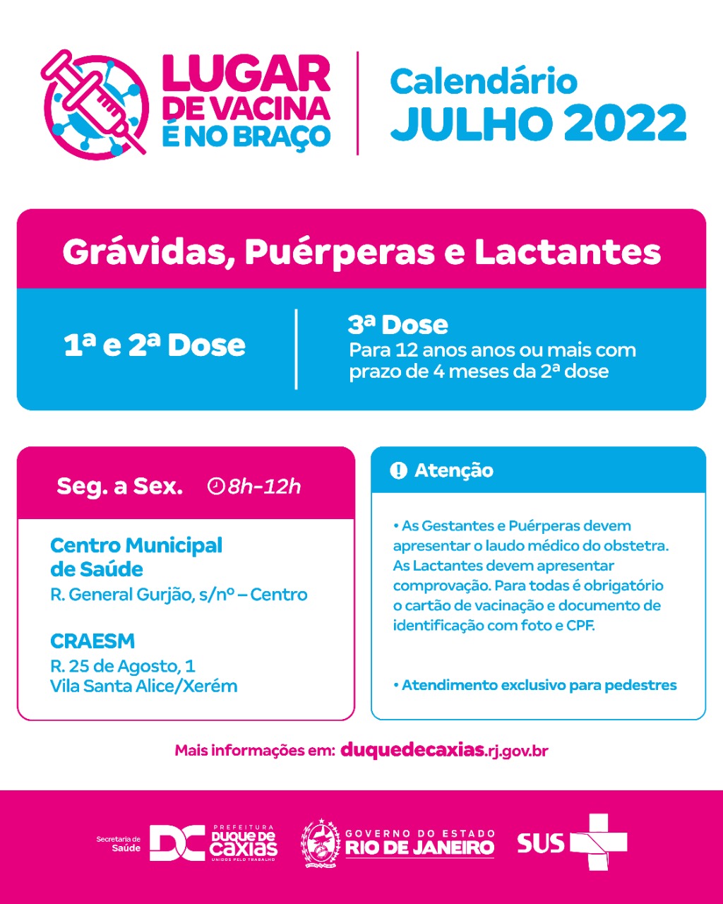 - Gestantes, Puérperas e Lactantes: Para esses grupos, a SMS está disponibilizando a primeira, segunda e terceira (para quem completou 4 meses da segunda dose), no Centro Municipal de Saúde (CMSDC) e no CRAESM de Xerém. As Gestantes e Puérperas devem apresentar o laudo médico do obstetra.