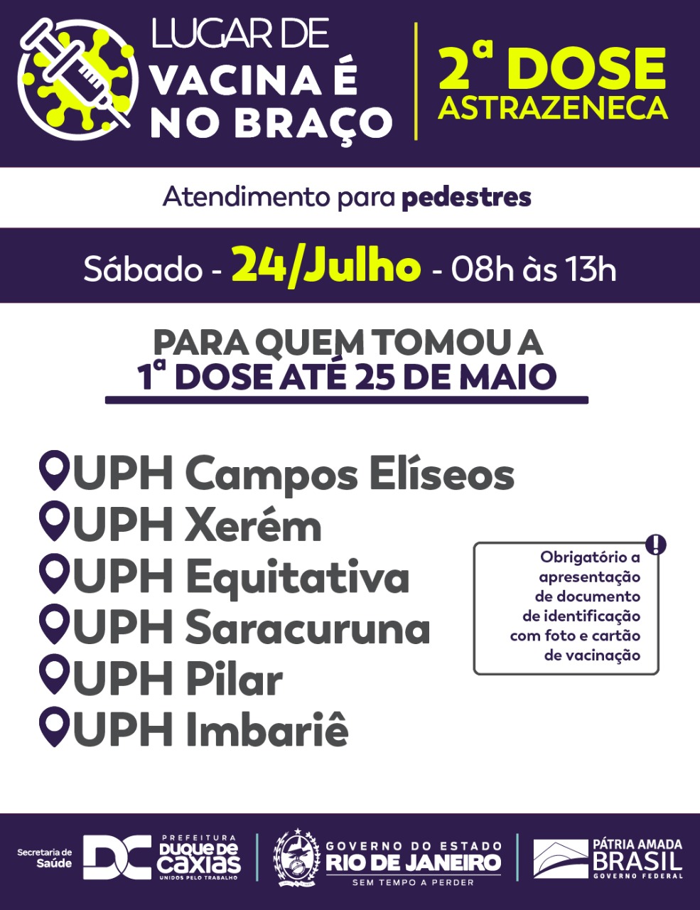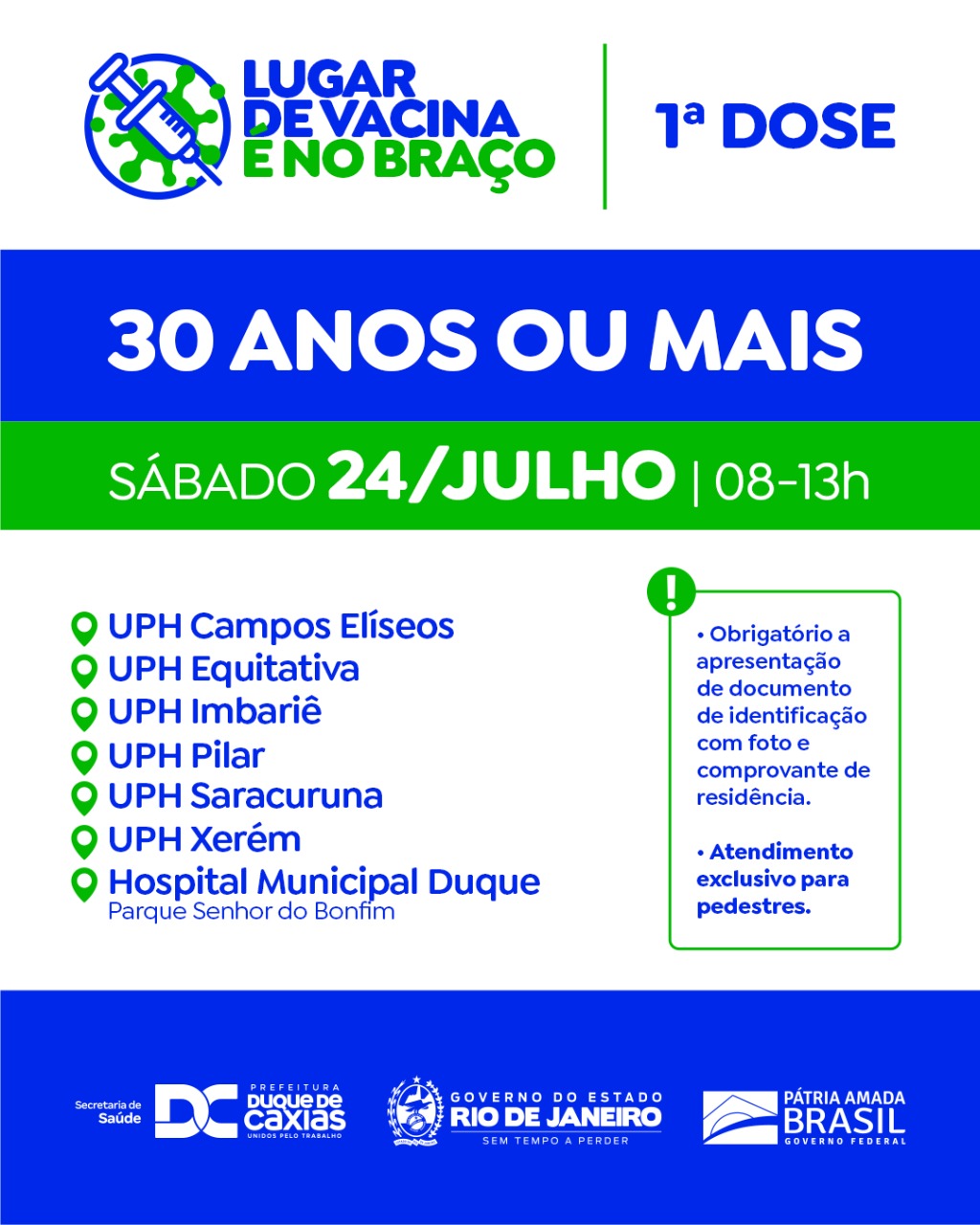 A Prefeitura de Duque de Caxias convoca quem tem 30 anos ou mais para receber a primeira dose da vacina contra a Covid-19, neste sábado (24/07). Para o mesmo dia está programado também a vacinação da segunda dose de Atrazeneca antecipada, para quem recebeu a primeira dose antes da data de 25 de maio. É obrigatório a apresentação do comprovante de residência e documento de identificação.