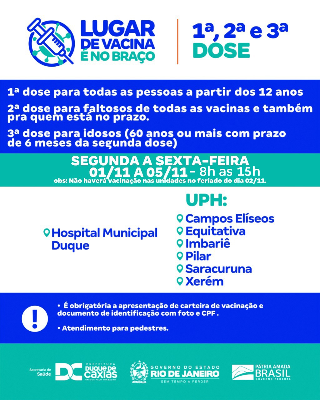 A três doses da vacina contra a Covid-19 estarão disponíveis para os seguintes grupos: primeira dose para todas as pessoas a partir dos 12 anos; segunda dose para faltosos e quem está no prazo de todas as vacinas; e terceira dose (reforço) para idosos (60 anos ou mais com prazo de 6 meses da segunda dose). A vacinação acontece de segunda (01/11) até sexta-feira (05/11), das 8h às 15h, no Hospital Municipal Duque, UPH Campos Elíseos, UPH Equitativa, UPH Imbariê, UPH Pilar, UPH Saracuruna, e UPH Xerém.