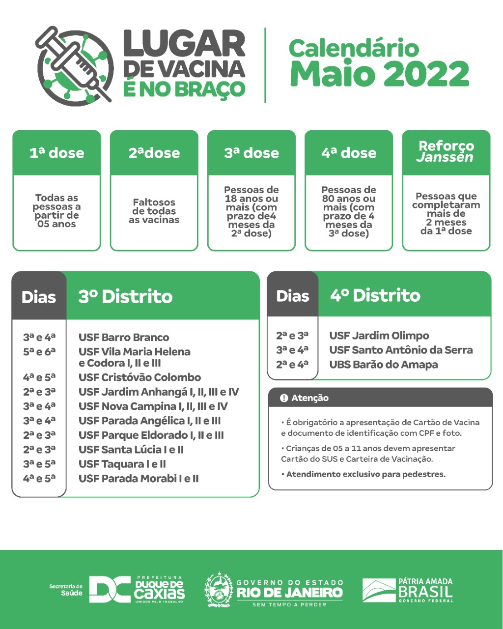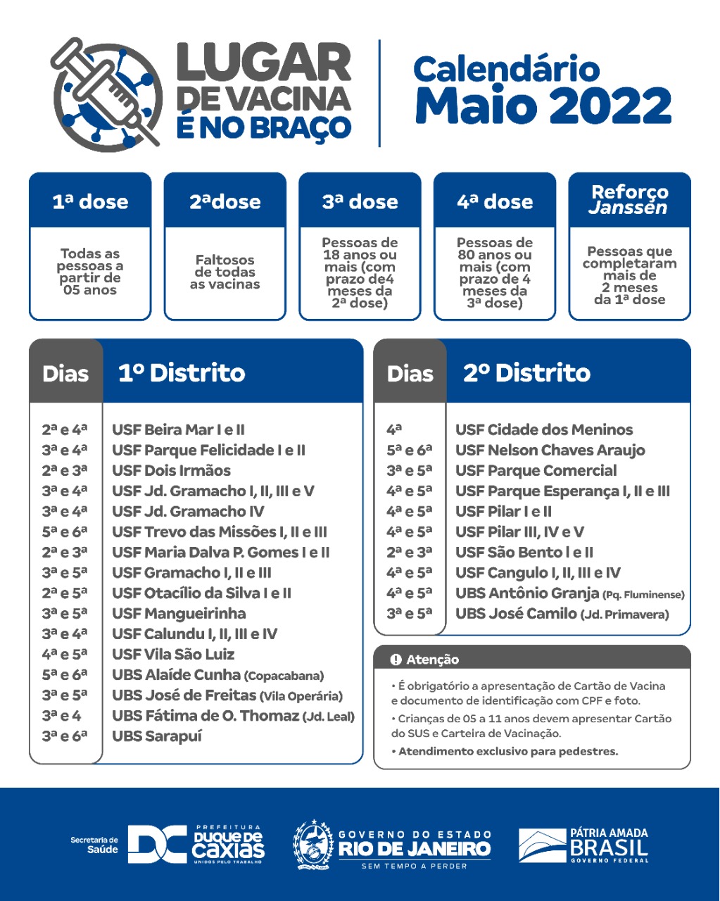 A Prefeitura de Duque de Caxias, através da Secretaria Municipal de Saúde, segue a semana (02 a 06/05) com a aplicação da segunda dose de reforço (quarta dose) da vacina contra a Covid-19 para os idosos com 80 anos ou mais, que tenham completado quatro meses da aplicação da terceira dose. A Secretaria Municipal de Saúde alerta que é obrigatório a apresentação do cartão de vacinação e documento de identificação com CPF e foto.