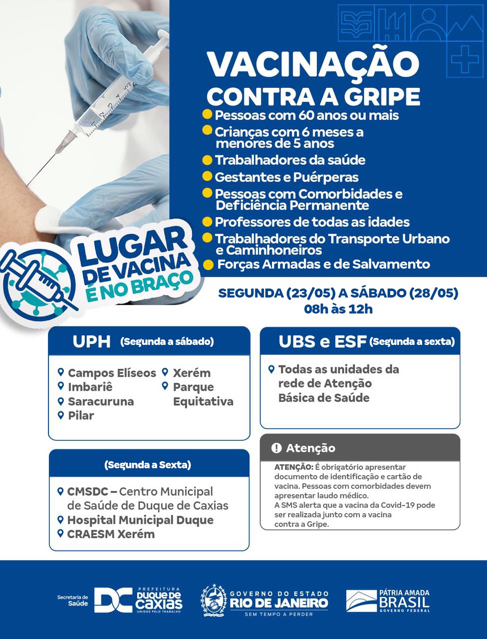A Prefeitura de Duque de Caxias, através da Secretaria Municipal de Saúde (SMS), segue nesta semana, de 23 a 28/05, com vacinação contra a Covid-19, Gripe Influenza e Sarampo.
