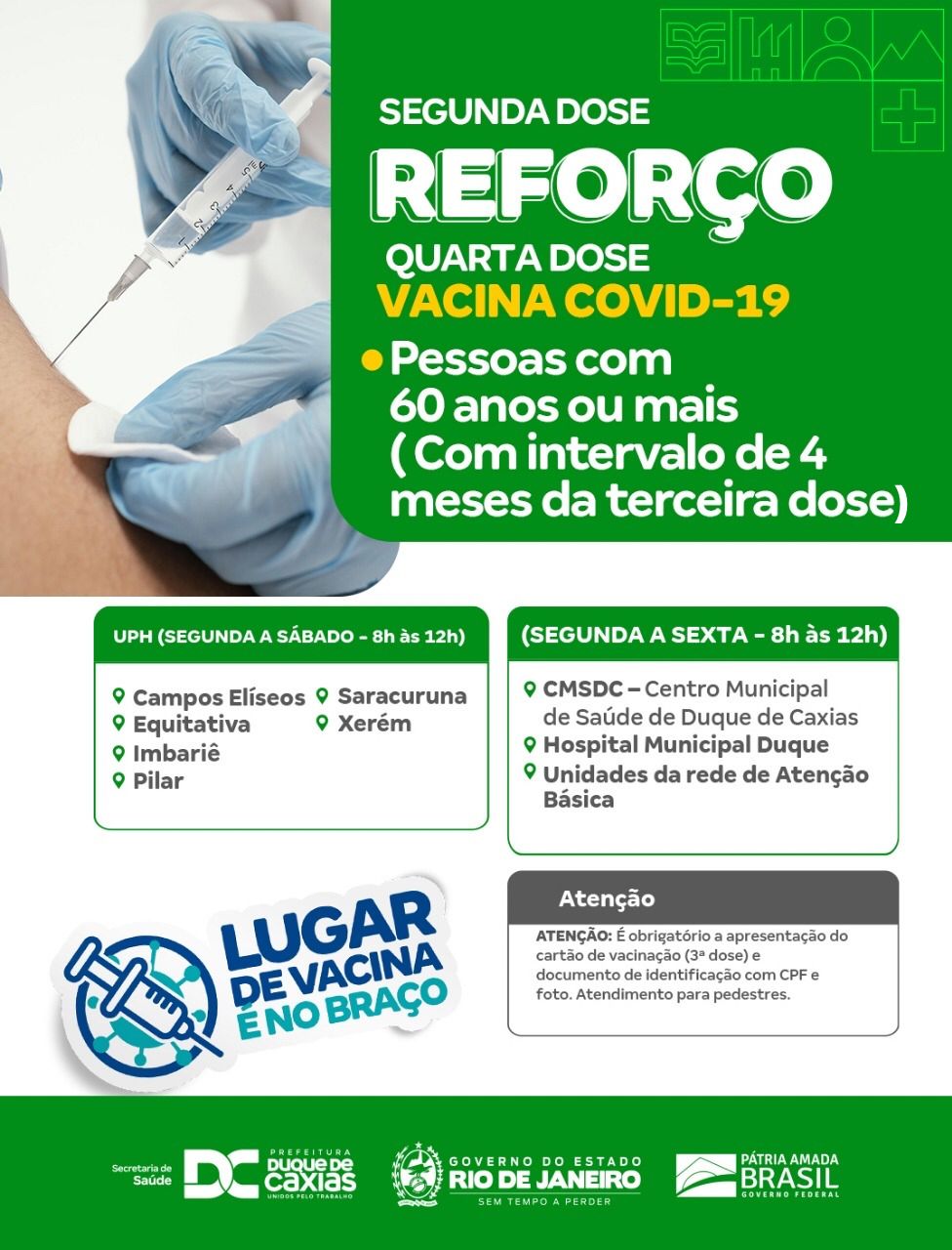 * Covid-19 – A Secretaria Municipal de Saúde informa reforça a convocação para a vacinação com a segunda dose de reforço (quarta dose), para todas as pessoas com 60 anos ou mais, que tenham completado quatro meses da aplicação da terceira dose.