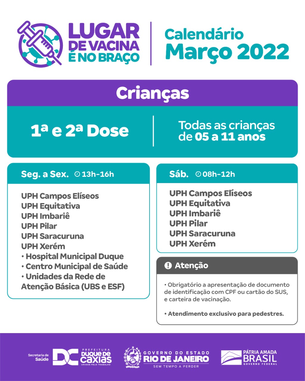 Adolescentes e Adultos (a partir de 12 anos), podem receber todas as doses da vacina contra a Covid-19, nas seguintes unidades, das 8h às 12h: - Hospital Municipal Duque - Centro Municipal de Saúde (CMSDC) - UPH Campos Elíseos - UPH Equitativa - UPH Imbariê - UPH Pilar - UPH Saracuruna - UPH Xerém.