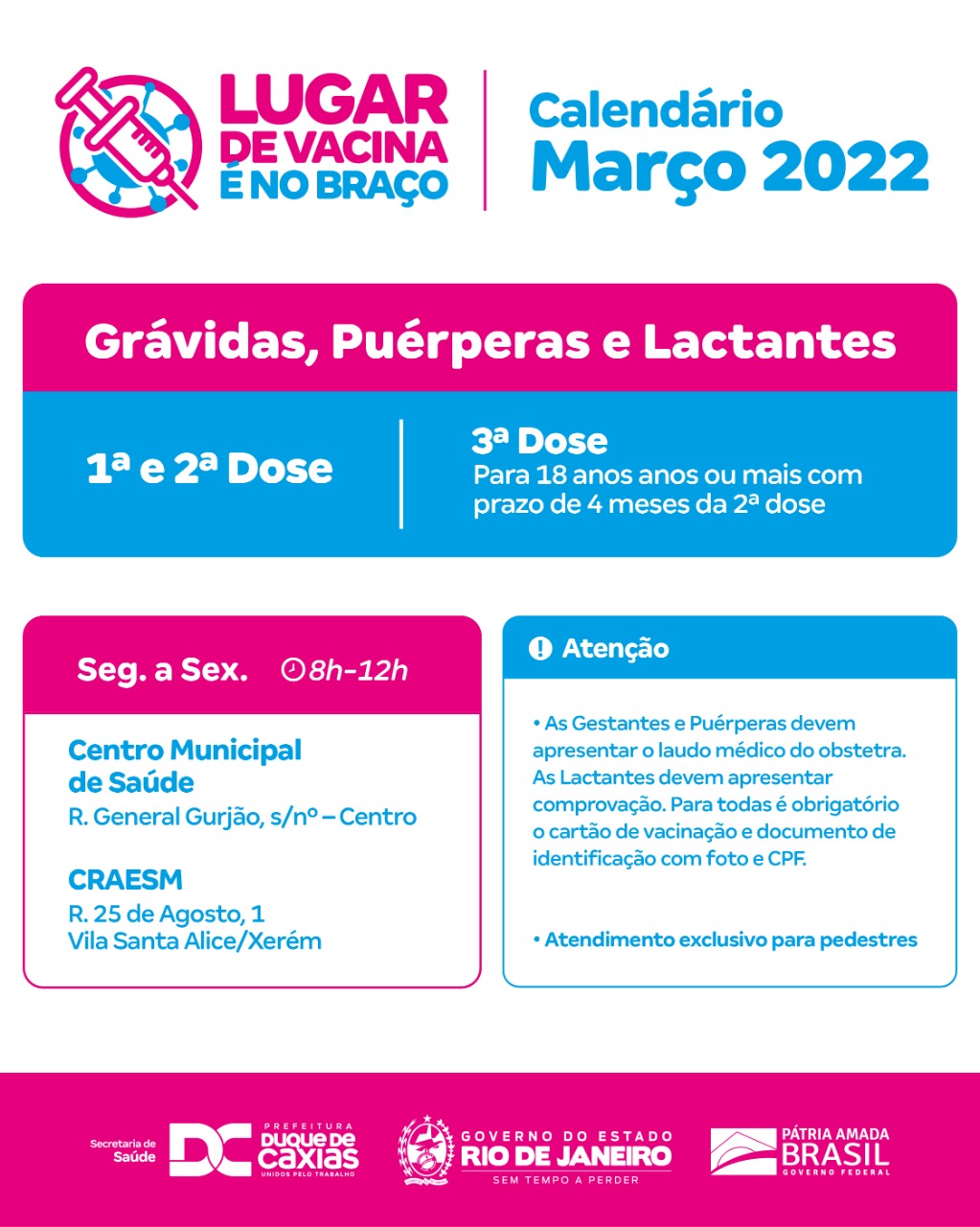 As Gestantes, Puérperas e Lactantes podem receber a primeira, segunda e terceira (para quem completou 4 meses da segunda dose) no Centro Municipal de Saúde (CMSDC) e no CRAESM de Xerém. As Gestantes e Puérperas devem apresentar o laudo médico do obstetra. As Lactantes devem apresentar comprovação. Nos três casos é obrigatória a apresentação de cartão de vacinação (segunda dose) e documento de identificação com CPF e foto.