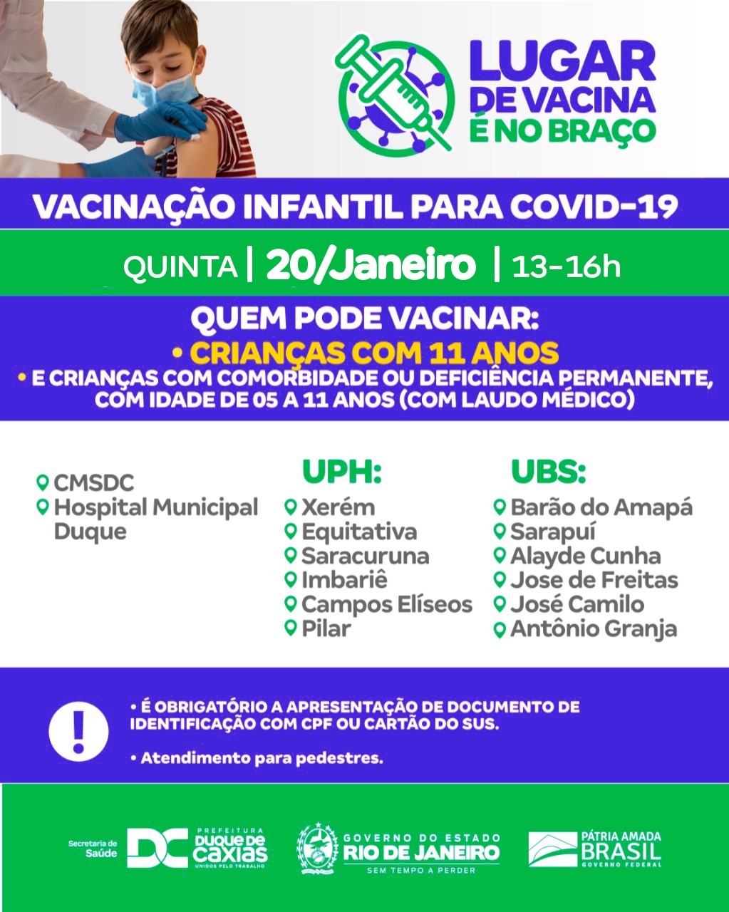 A Prefeitura de Duque de Caxias segue nesta quinta-feira (20) com a vacinação infantil para crianças com 11 anos e para aquelas com comorbidades ou deficiência permanente (de 5 a 11 anos), mediante a apresentação de laudo médico. A Secretaria Municipal de Saúde alerta aos responsáveis sobre a obrigatoriedade de levar documento de identificação com CPF ou Cartão do SUS da criança.
