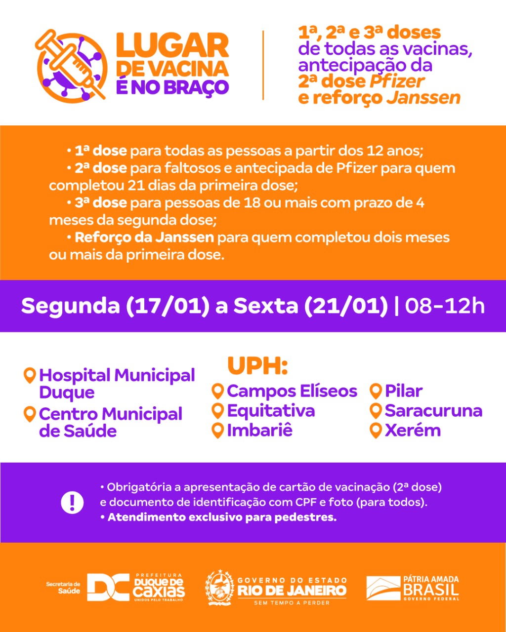 * Vacinação contra a Covid-19 para adolescentes a partir de 12 anos e adultos -* Duque de Caxias segue também com a aplicação de todas as doses da vacina contra a Covid-19, nas seguintes unidades, das 8h às 12h: Hospital Municipal Duque - CMSDC - UPH Campos Elíseos - UPH Equitativa - UPH Imbariê - UPH Pilar - UPH Saracuruna - UPH Xerém. As mais de 40 unidades da rede de Atenção Básica também disponibilizam as três doses da vacina, das 8h às 12h. Para a vacinação é obrigatório a apresentação de cartão de vacinação e documento de identificação com foto.