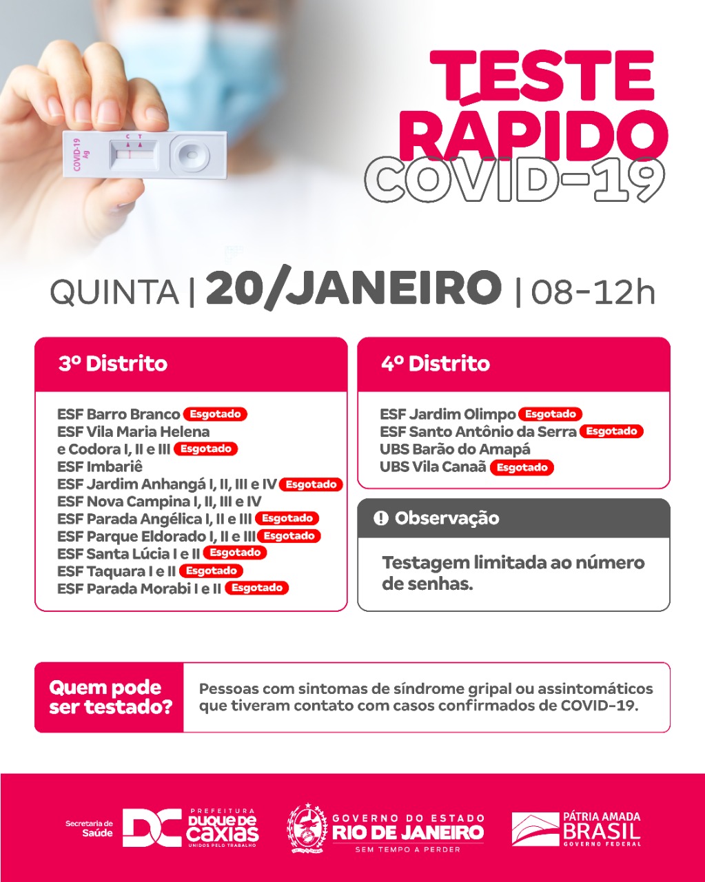 Podem fazer o teste rápido para a Covid-19 todas as pessoas que apresentem sinais respiratórios agudos ou, pelo menos, dois dos sintomas listados, façam o teste rápido: febre, calafrios, dor de garganta, dor de cabeça, tosse, coriza e distúrbios olfativos ou degustativos. A testagem também é recomendada para todos aqueles que tiveram contato recente com casos positivos de Covid-19. A SMS alerta que a testagem será limitada ao número de senhas disponíveis em cada unidade.