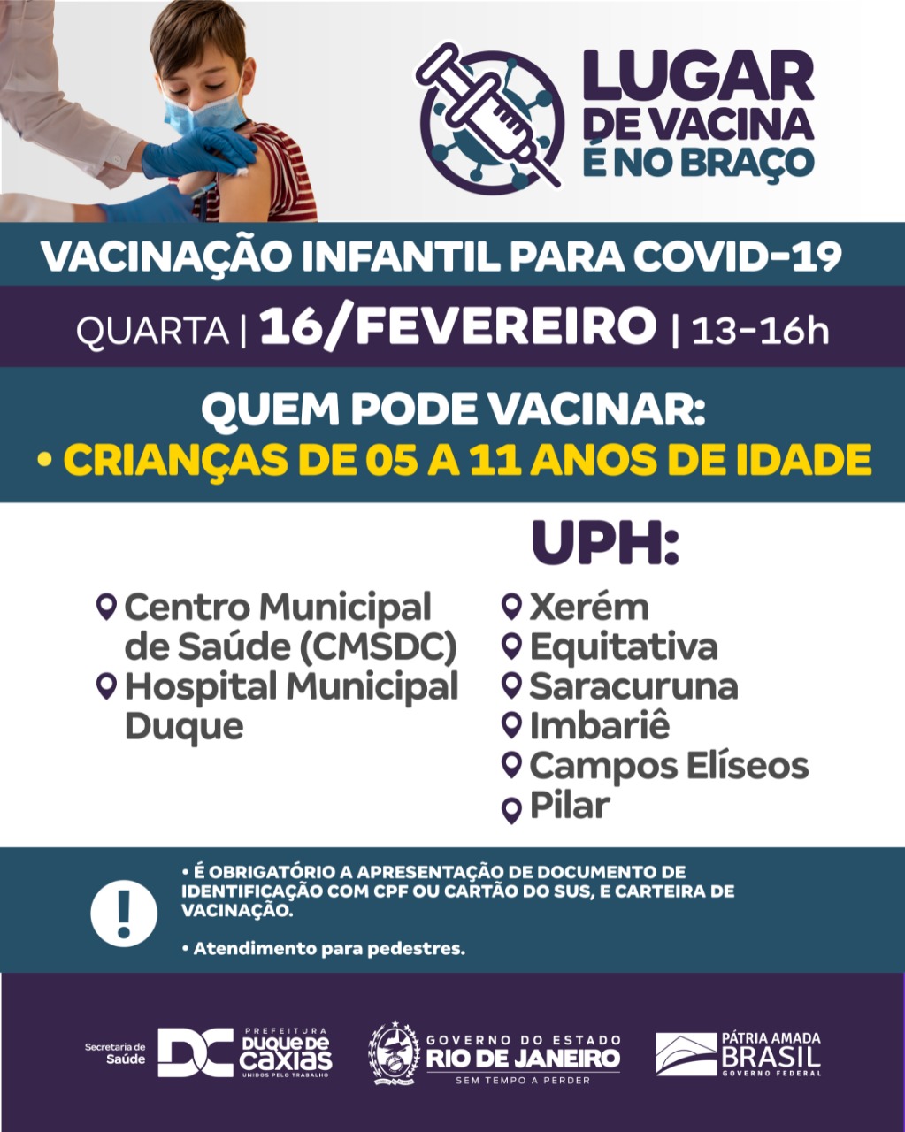 A vacinação infantil acontece, das 13h às 16h, com atendimento para pedestres, nas seguintes unidades: - Centro Municipal de Saúde (CMSDC) - Hospital Municipal Duque - UPH Xerém - UPH Equitativa - UPH Saracuruna - UPH Imbariê - UPH Campos Elíseos - UPH Pilar.