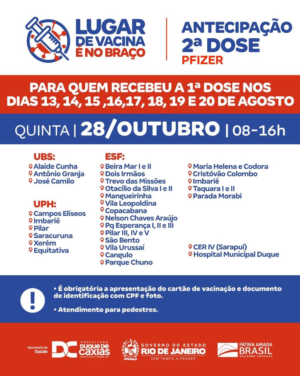 A Prefeitura de Duque de Caxias segue nesta quinta-feira (28/10) com o mutirão de segunda dose antecipada da vacina Pfizer para todos que foram vacinados nos dias 13, 14, 15, 16, 17, 18, 19 e 20 de agosto. A Secretaria Municipal de Saúde reforça a obrigatoriedade da apresentação de carteira de vacinação e documento de identificação com CPF e foto.