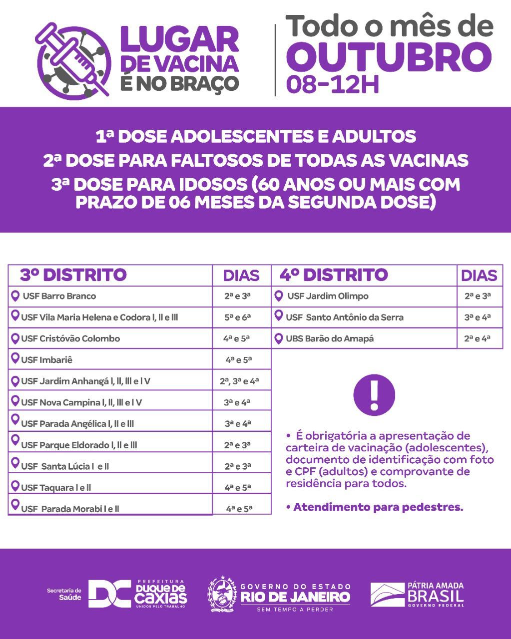 É obrigatória a apresentação de carteira de vacinação (segunda e terceira doses) e documentos de identificação com CPF e foto (todos os grupos). O atendimento será para pedestres.