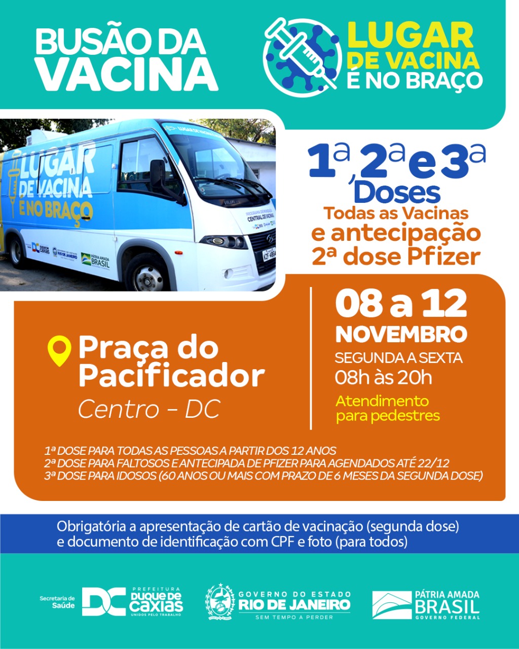Nesta sexta-feira (12/11), a Prefeitura de Duque de Caxias, através da Secretaria Municipal de Saúde, fará vacinação com a segunda dose de Pfizer antecipada, para aqueles que estão agendados até 22 de dezembro. A vacinação segue também em todo o município com a primeira dose (para pessoas acima de 12 anos), segunda dose (para os faltosos de todas as vacinas) e terceira dose para idosos (60 anos ou mais com prazo de 6 meses da segunda dose).